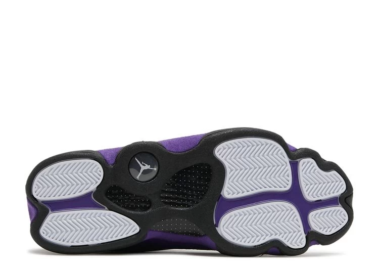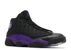 The Air Jordan 13 Retro ‘Court Purple’ showcases the same color blocking on the OG ‘Bred’ colorway, which MJ wore on the road throughout the 1998 Playoffs, up until the Finals. The mid-top features reflective black mesh overlays throughout the upper, built with a blend of black tumbled leather and purple synthetic suede. Embroidered Jumpman branding decorates the microfiber tongue, while the familiar cat eye hologram graces the lateral ankle. Underfoot, the distinctive panther paw outsole is fitted with herringbone-traction rubber pods for grippy traction.