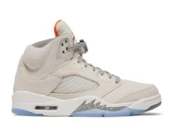 The Air Jordan 5 Retro SE ‘Craft’ updates the legacy silhouette with a subtle color palette and a refreshed build. Crafted from taupe-colored suede and textile, the upper is secured with two-tone laces and accented with translucent quarter-panel netting. Orange textile lines the tongue, matching the signature Jumpman that decorates the exterior. A second Jumpman icon graces the heel overlay in grey embroidery. The mid-top rides on an off-white polyurethane midsole, featuring speckled shark-tooth detailing and a visible Air-sole unit in the heel. Underfoot, a translucent herringbone-pattern rubber outsole yields superior stop-and-go traction.