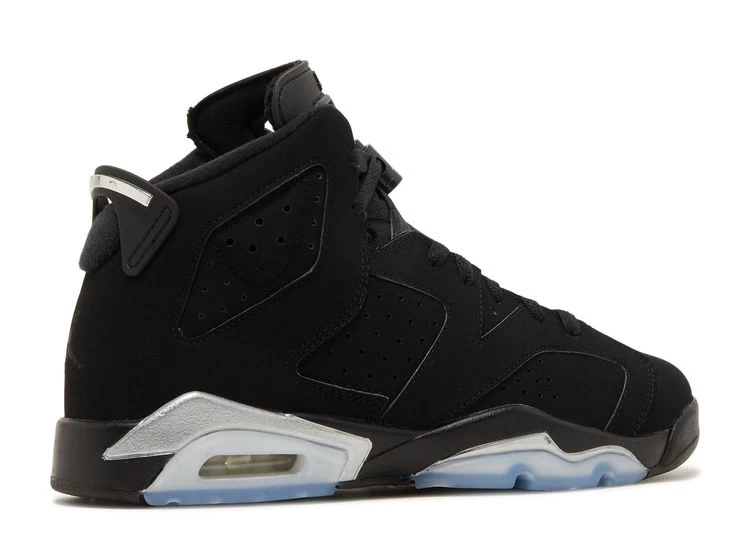 Built for big kids, the Air Jordan 6 Retro GS ‘Chrome’ takes a design page from an AJ6 Low colorway from 2015. The classic silhouette dons a black synthetic nubuck upper, complete with heritage details that include perforated underlays, an extended pull tab at the heel, and a molded easy-grip tongue. Jumpman branding appears on the lace guard, back heel, and sockliner. Chrome accents shine on the lightweight foam midsole, enhanced with visible Air-sole cushioning and supported by a translucent rubber outsole.