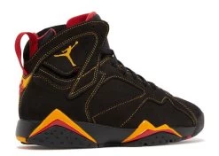 The 2022 edition of the Air Jordan 7 Retro ‘Citrus’ revives a non-OG colorway that was initially released in 2006. Like the original, the upper is constructed from black nubuck with a Huarache-like inner sleeve and contrast orange stitching throughout. The Citrus hue is repeated on the angular ‘23’ heel patch and a Jumpman logo embroidered on the lateral collar. A red webbing pull tab at the heel provides easy on and off. Orange and crimson accents reappear on the black foam midsole, featuring encapsulated Air-sole cushioning for a smooth ride.