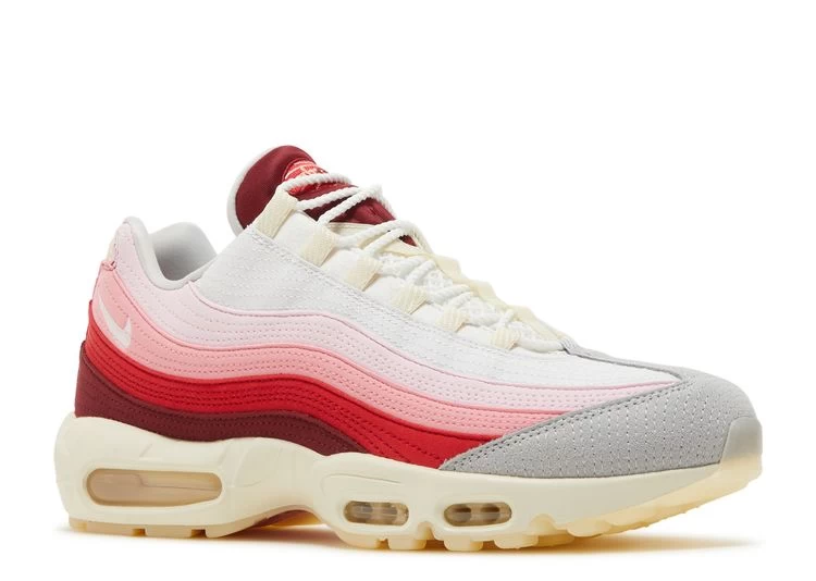The Nike Air Max 95 ‘Anatomy of Air’ taps into the shoe’s design origins, highlighted by unique details that take cues from the human anatomy. Twisted rope laces secure a synthetic suede upper built with wavy side overlays in muscle-inspired colors. Gradient tones ranging from pink to burgundy are contrasted by a suede toe cap in a neutral grey finish. Lightweight cushioning comes courtesy of a cream-colored polyurethane midsole with visible Air-sole units in the forefoot and heel.