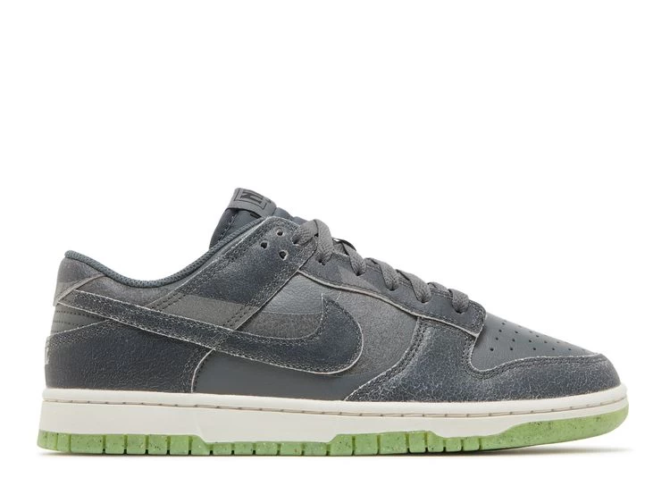 The Nike Dunk Low SE ‘ Cauldron’ celebrates Halloween with an aged aesthetic, unique details, and a vibrant pop of color underfoot. A dark grey finish is executed on the upper, featuring a smooth leather base with tonal cracked leather overlays and a matching signature Swoosh. Reflective accents include a ‘shadow’ Swoosh on the lateral side and a Nike wordmark on the back heel. The sneaker is mounted on an off-white midsole, supported by a lightly speckled Scream Green rubber outsole.