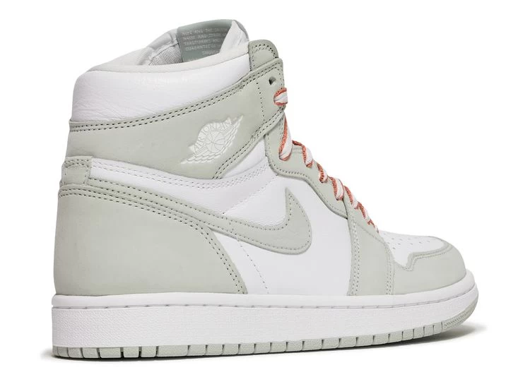 The womenβs Air Jordan 1 Retro High OG βSeafoamβ delivers a subtle two-tone colorway of the 1985 sneaker that started it all. The all-leather upper features a crisp white base with contrasting overlays in a soft green finish. The pastel hue is repeated on the sneakerβs branding elements, which include the signature Swoosh and Nike Air tongue tag. Contrasting color arrives via Healing Orange trim on the flat woven laces. The high-top is anchored by a durable rubber cupsole with encapsulated Air sole cushioning in the heel.